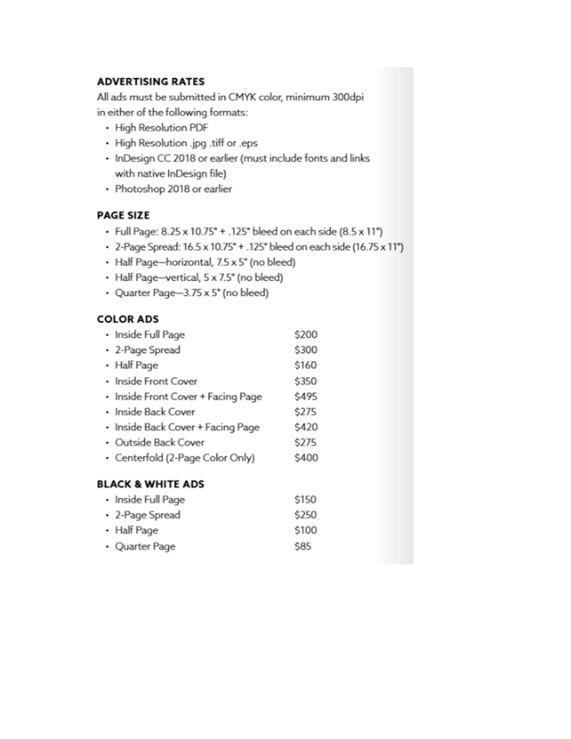 Please click here for a complete list of ad rates and specifications. Ads are due by the 8th of the month prior to publication (i.e. Ads for January-February Review are due by December 8th)